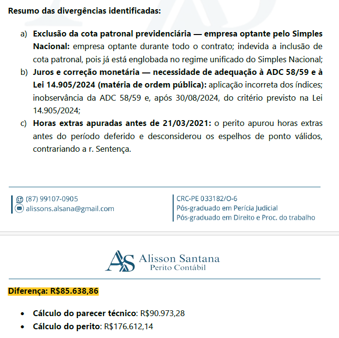 Atuo auxiliando advogados na elaboração de cálculos para petições iniciais, liquidações de sentença, impugnações e pareceres técnicos contábeis, sempre fundamentado na legislação vigente e na jurisprudência atualizada.
